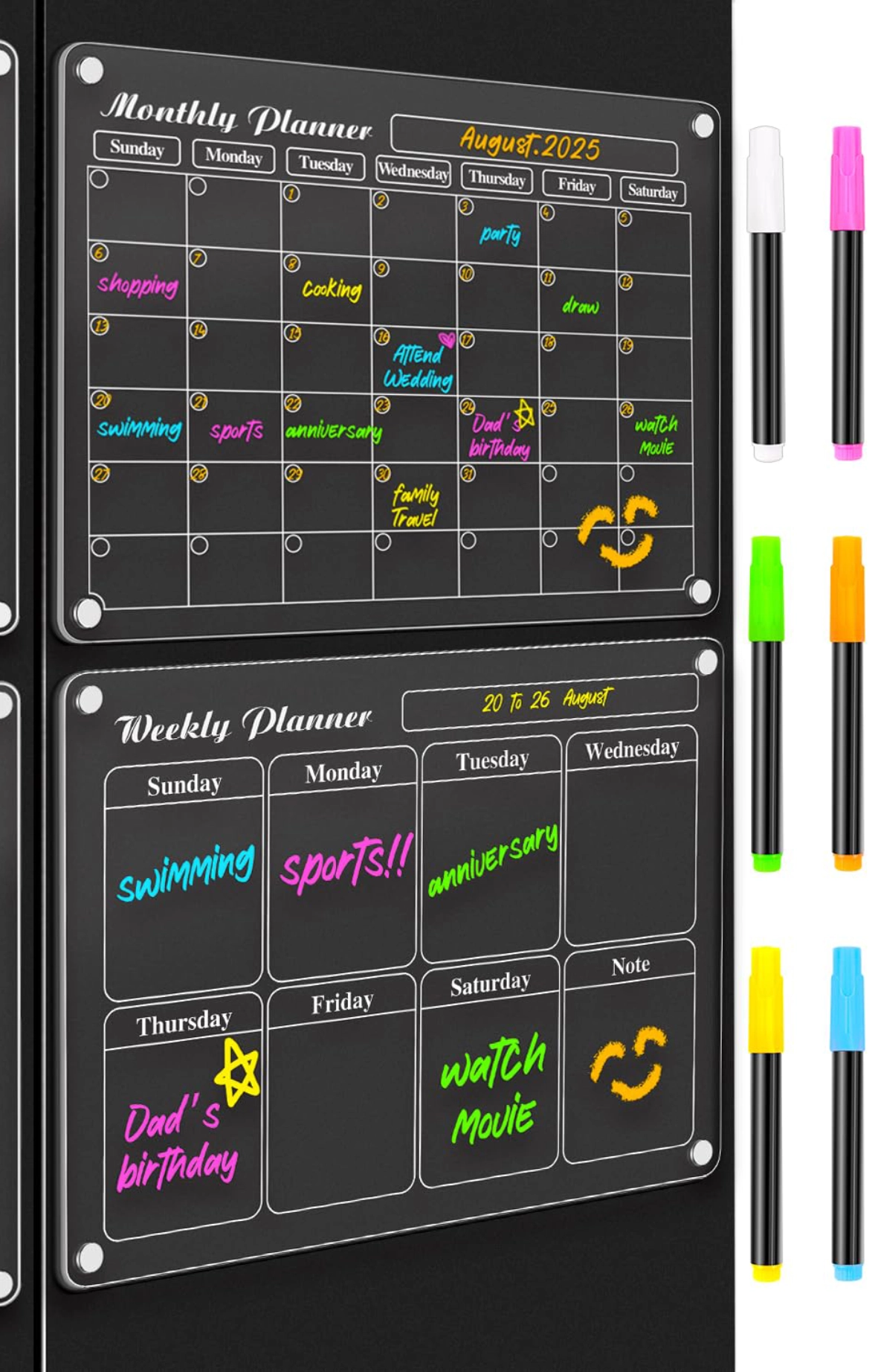 Stay organized with DIYMAG’s 4-pack acrylic magnetic calendars. Includes weekly, monthly, and daily planners with 6 colorful markers for clear scheduling on your fridge.