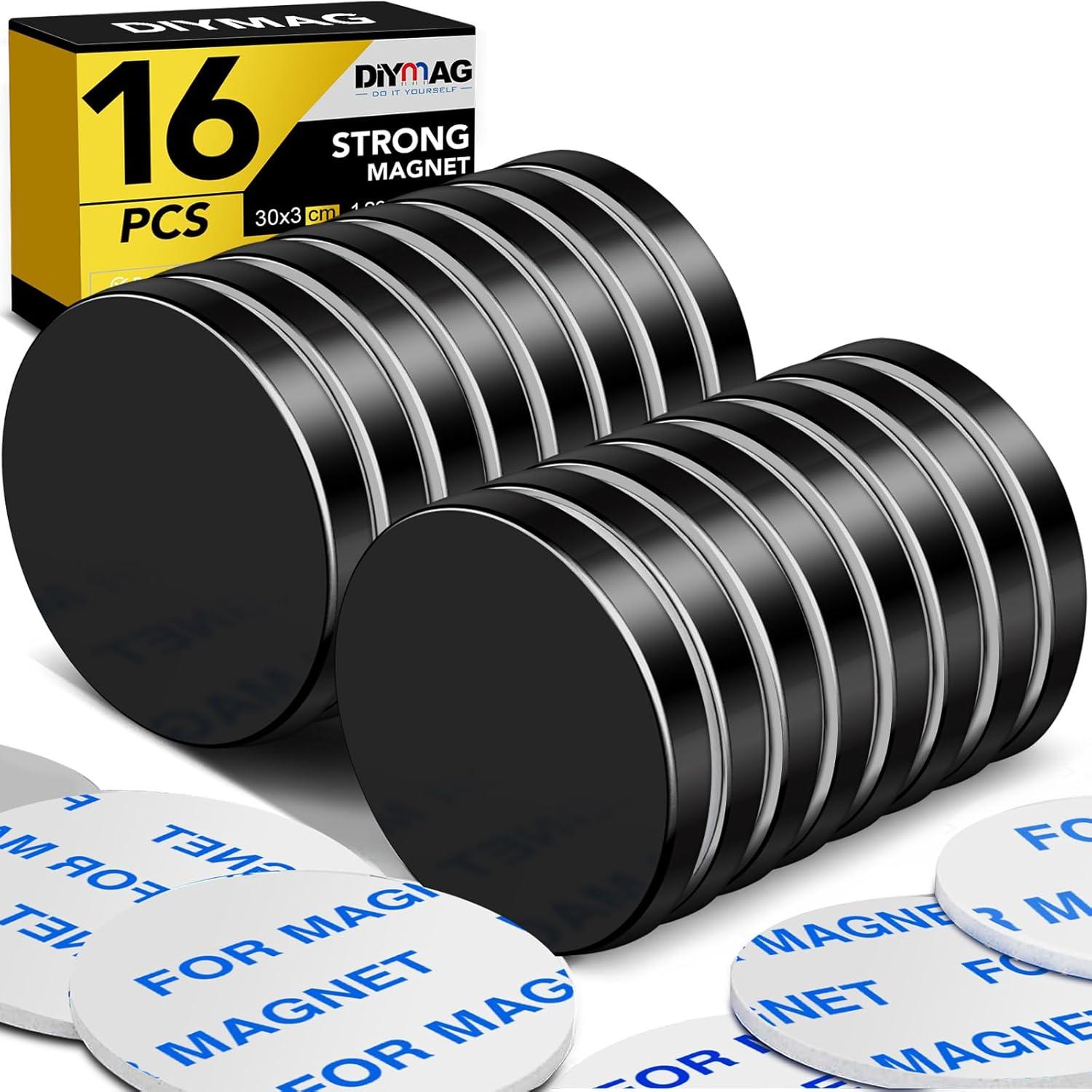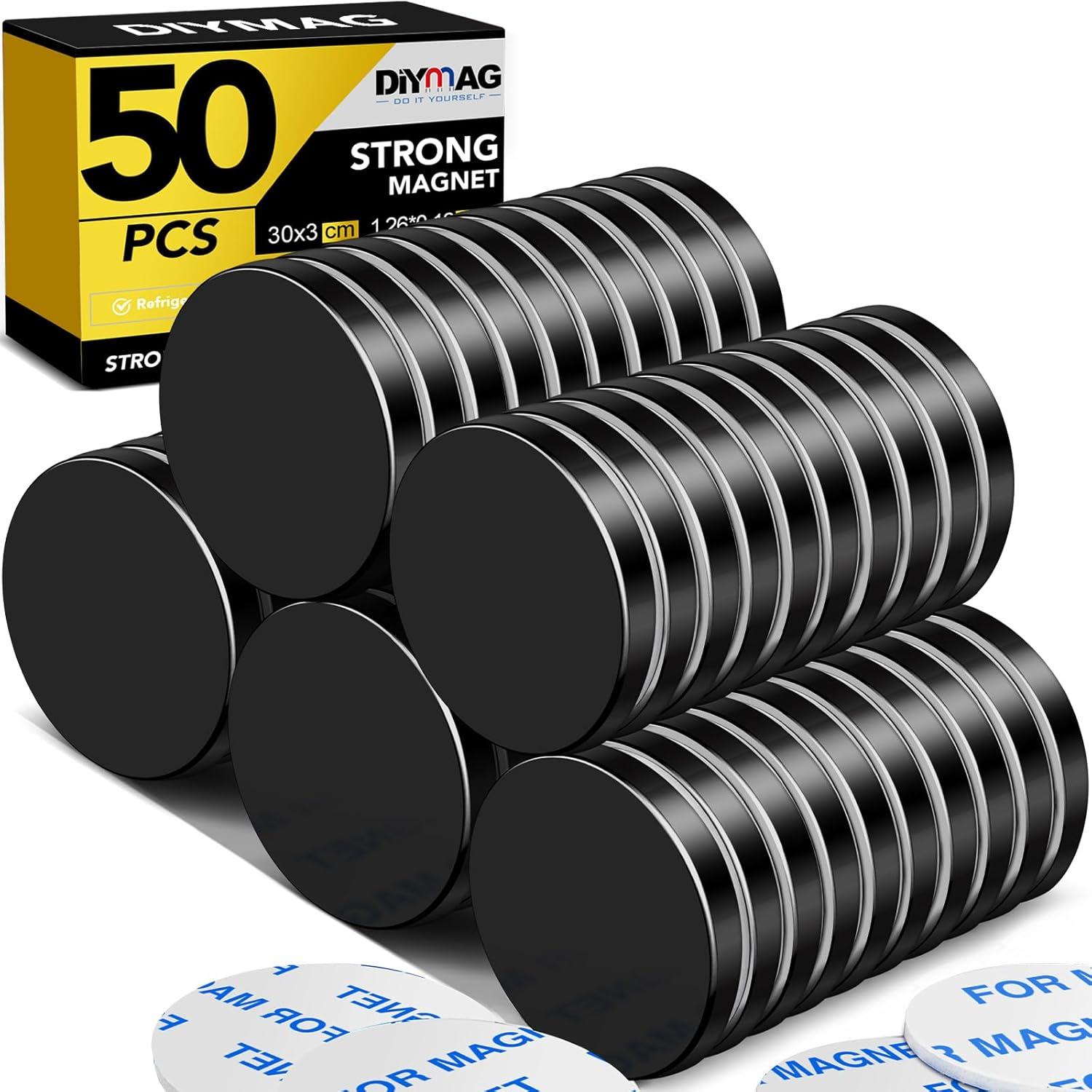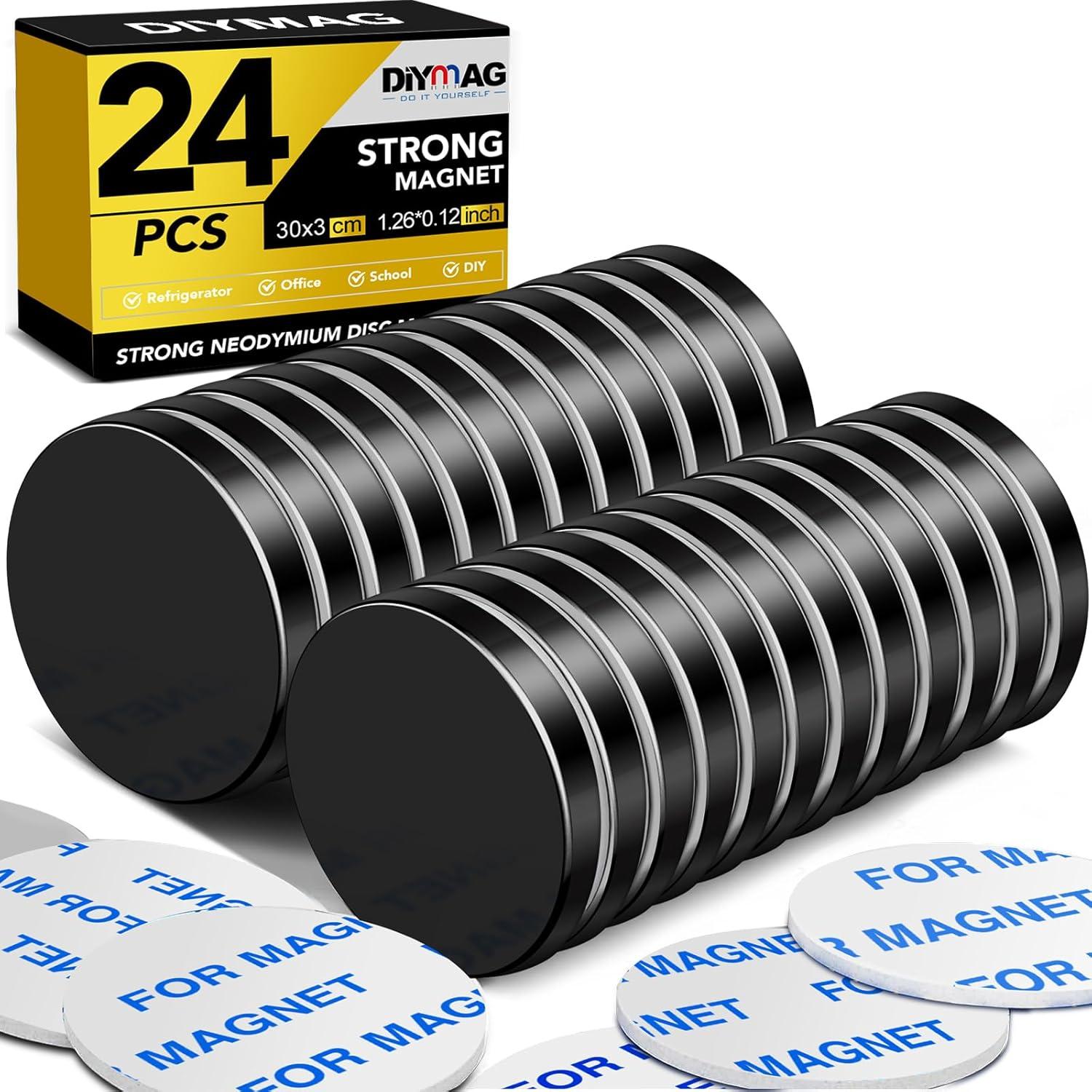 DIYMAG 20 Pack Strong Magnets with Double Sided Adhesive, 1.26" x 0.12" Round Permanent Powerful Neodymium Disc Rare Earth Magnet for Fridge Classroom DIY Building Scientific Craft and Office Black(Black)