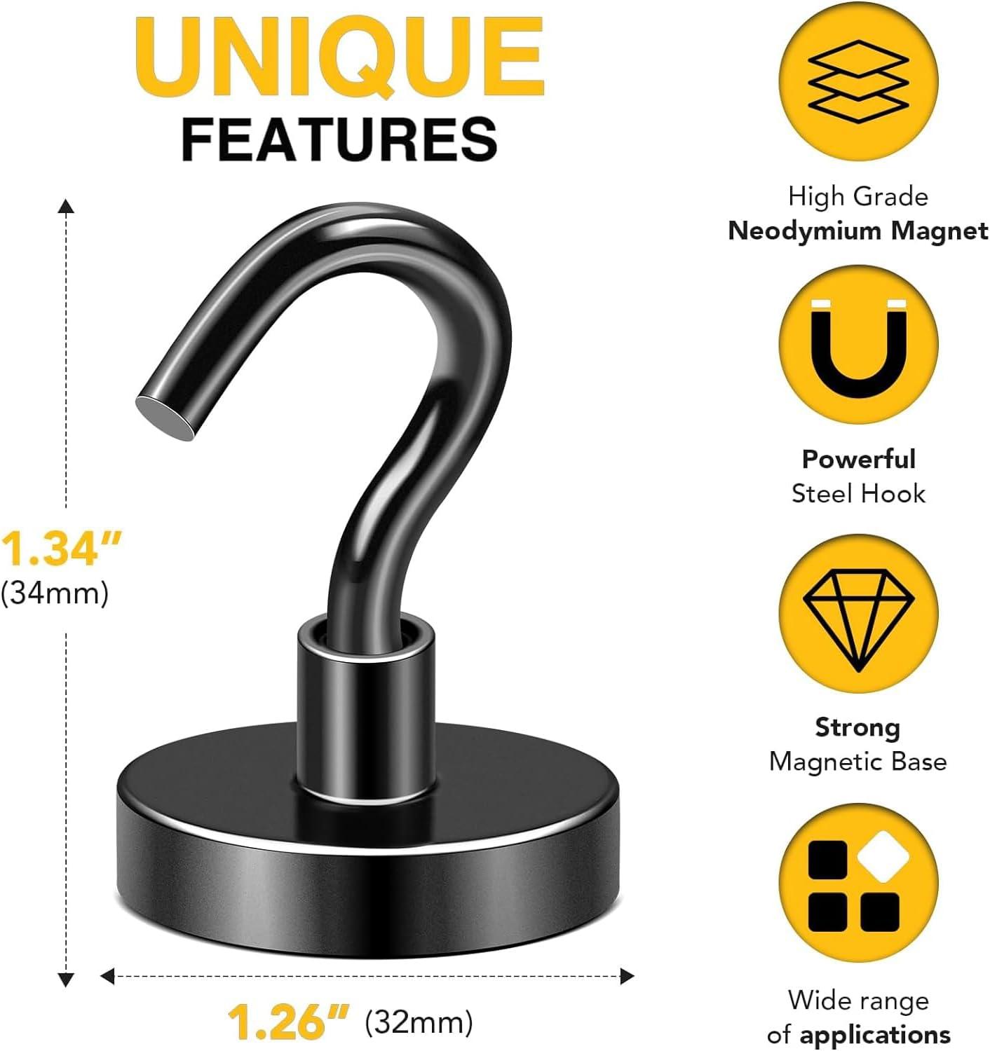【Versatile Use】Super strong neodymium 150 lb magnets with hooks are perfect for hanging grill tools, decorative lights and tool accessories, also be widely used in cruise, fridge, kitchen, workplace office, garage, indoor, outdoor and anywhere there is iron or steel. No drilling holes, No sticky residue, No bolt or screws; Easy to install or remove and reusable.