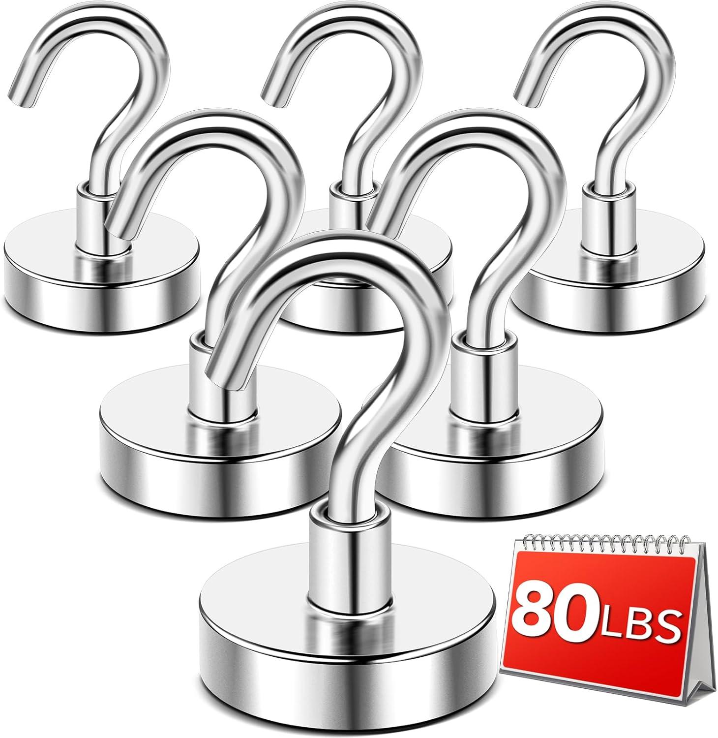 DIYMAG Magnetic Hooks,110 lb Heavy Duty Strong Magnet with Hook for Hanging, Strong Rare Earth Neodymium Magnet Hooks 6 Packs(25mm-80lbs)