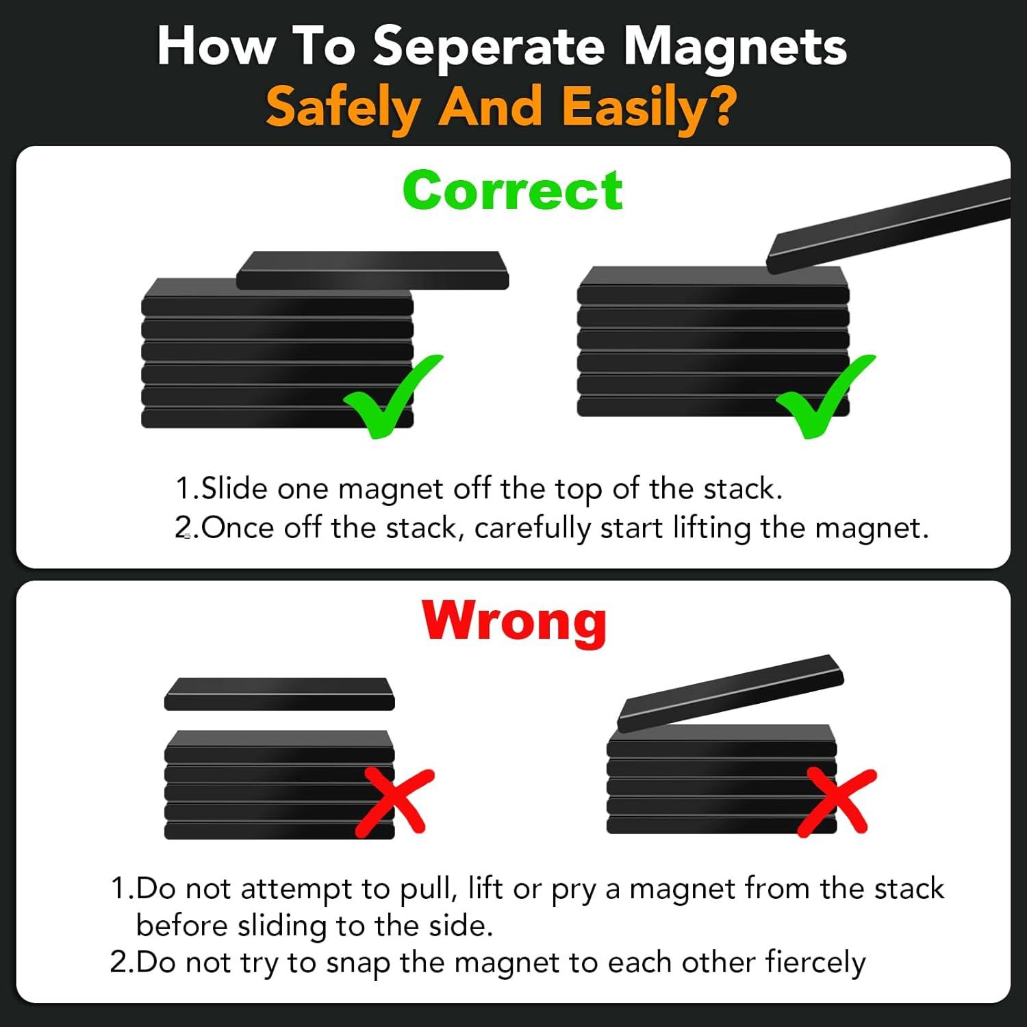 【PREMIUM COATING】Coated with three layers of nickel, copper and nickel to reduce corrosion and provide a smooth finish which greatly increase the longevity of the rare earth bar magnets.Sturdy and reliable. When you separate the strip magnets, be careful and slide gently