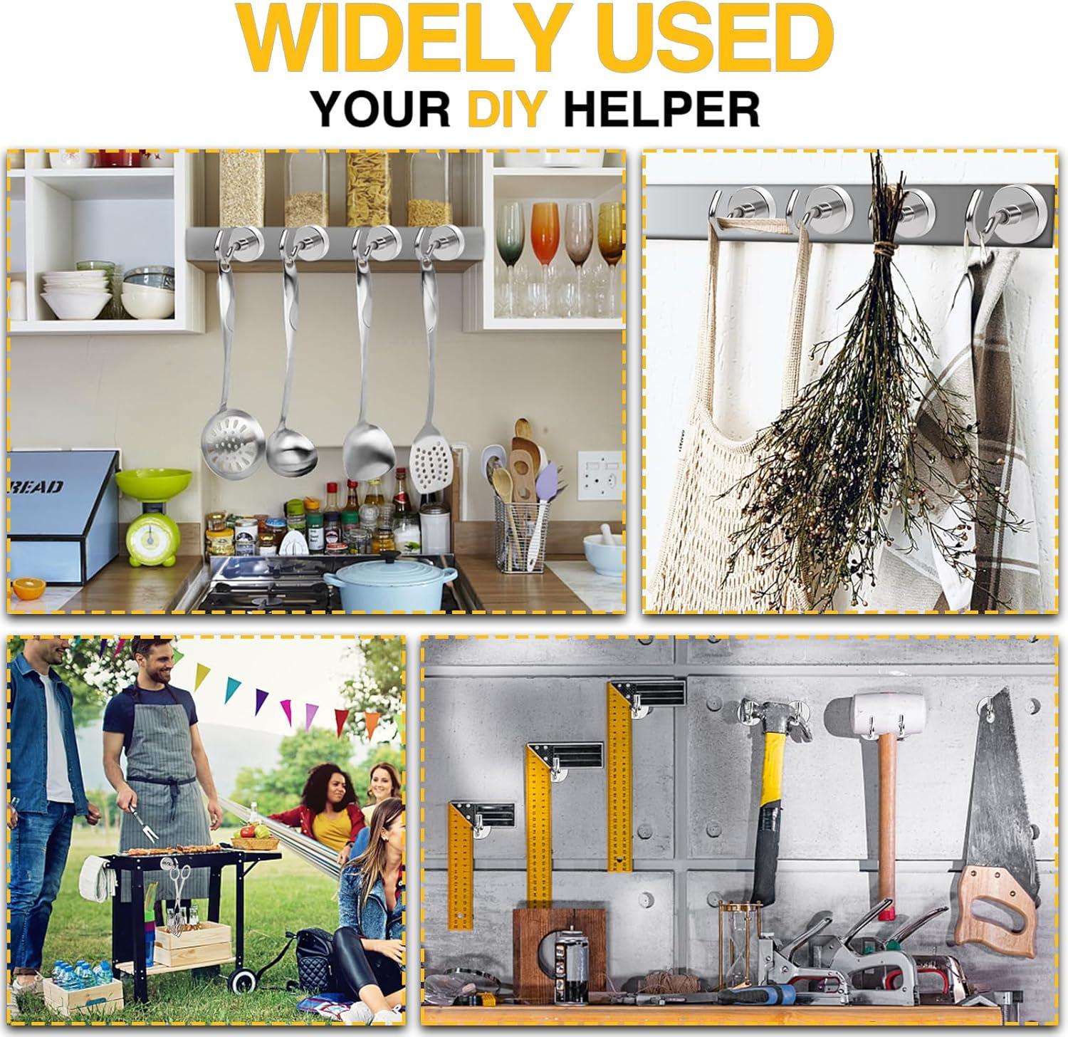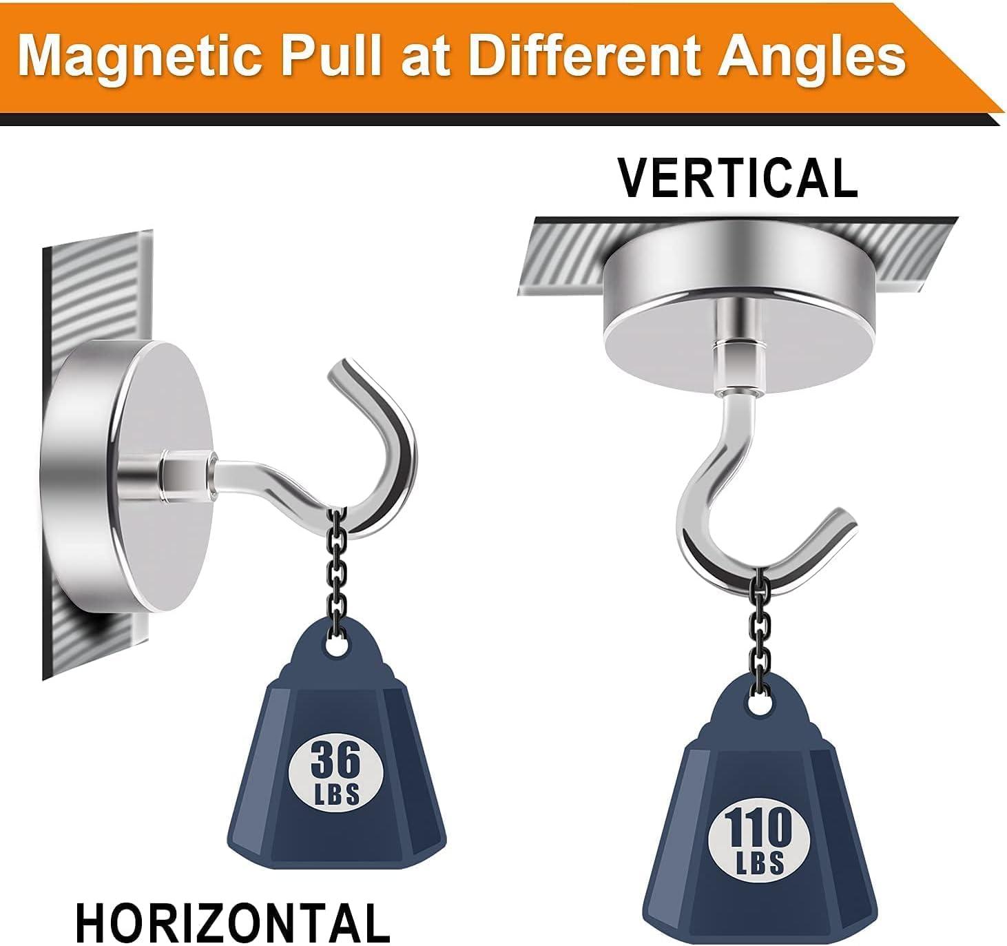 POWERFUL & DURABLE:We provide 3 layers of coating on the metal base, metal hook and magnet: Ni-Cu-Ni, so our magnet hooks have excellent anti-corrosion and scratch resistance. The magnetic hooks use high-quality neodymium magnets, which provide a strong magnetic force and can hang items weighing up to 30 pounds