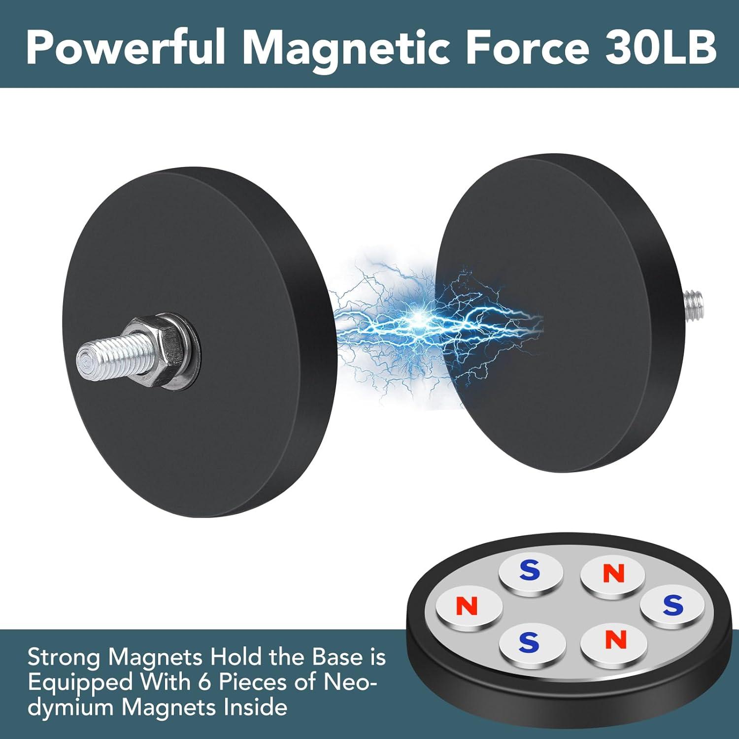 Strong Magnets Hold the Base: Round base with rubber coating is measured 3.5″ in diameter, and it is equipped with 12 pieces of neodymium magnets inside, has a vertical magnetic pull force of 10LBS on base of steel plate.