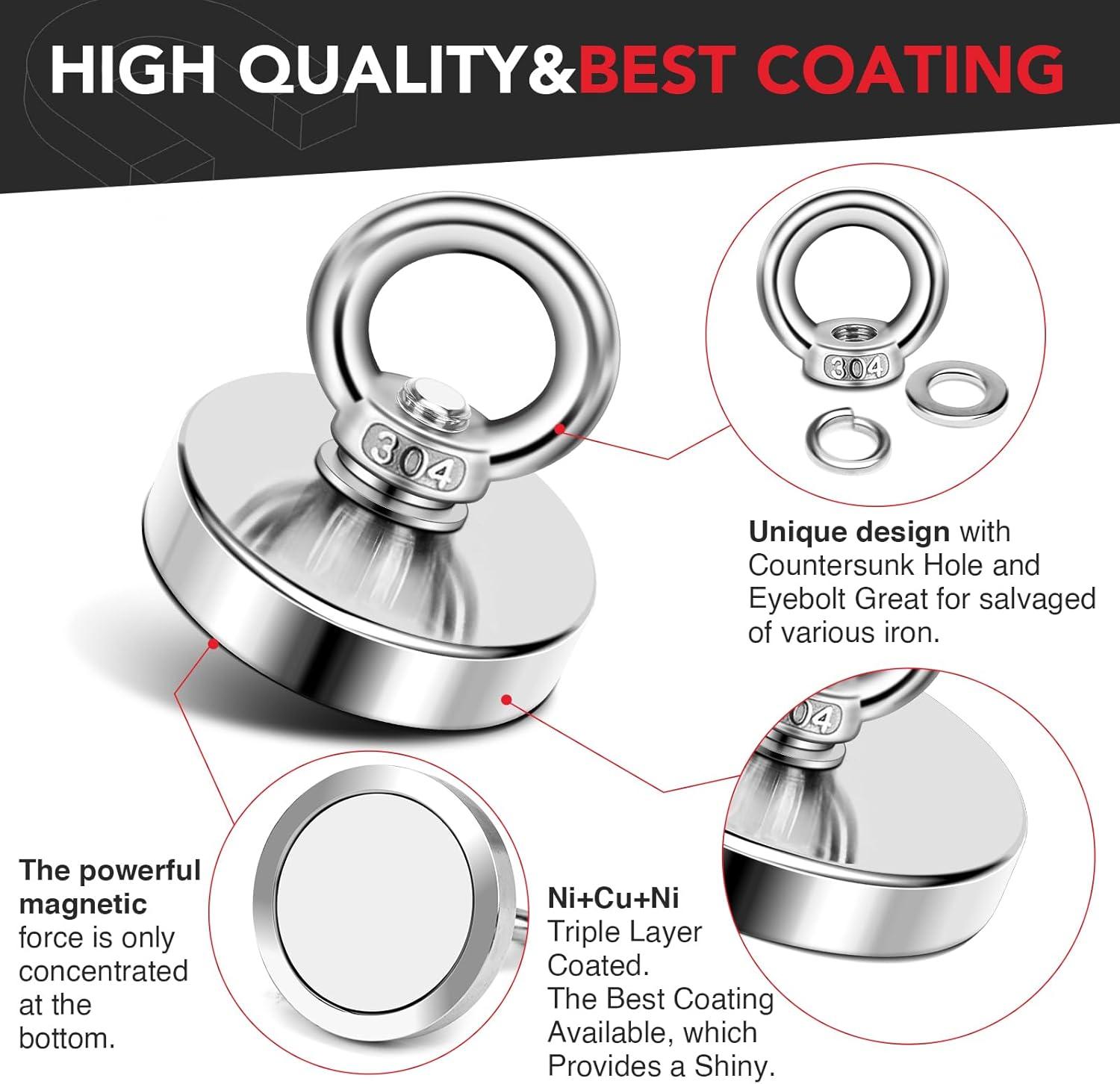 SUPER POWERFUL – This fishing magnets is 2.95″(75 mm) in diameter, adopt strong neodymium magnet for its base. It can offer 700 LBS(318 KG) pulling strength under ideal condition.